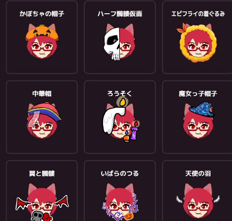 シュリンピアではアバターデコレーションの追加に消極的だったんですが、10月31日のハロウィンに向けて、仮装できるアバターデコレーションを募集しました。